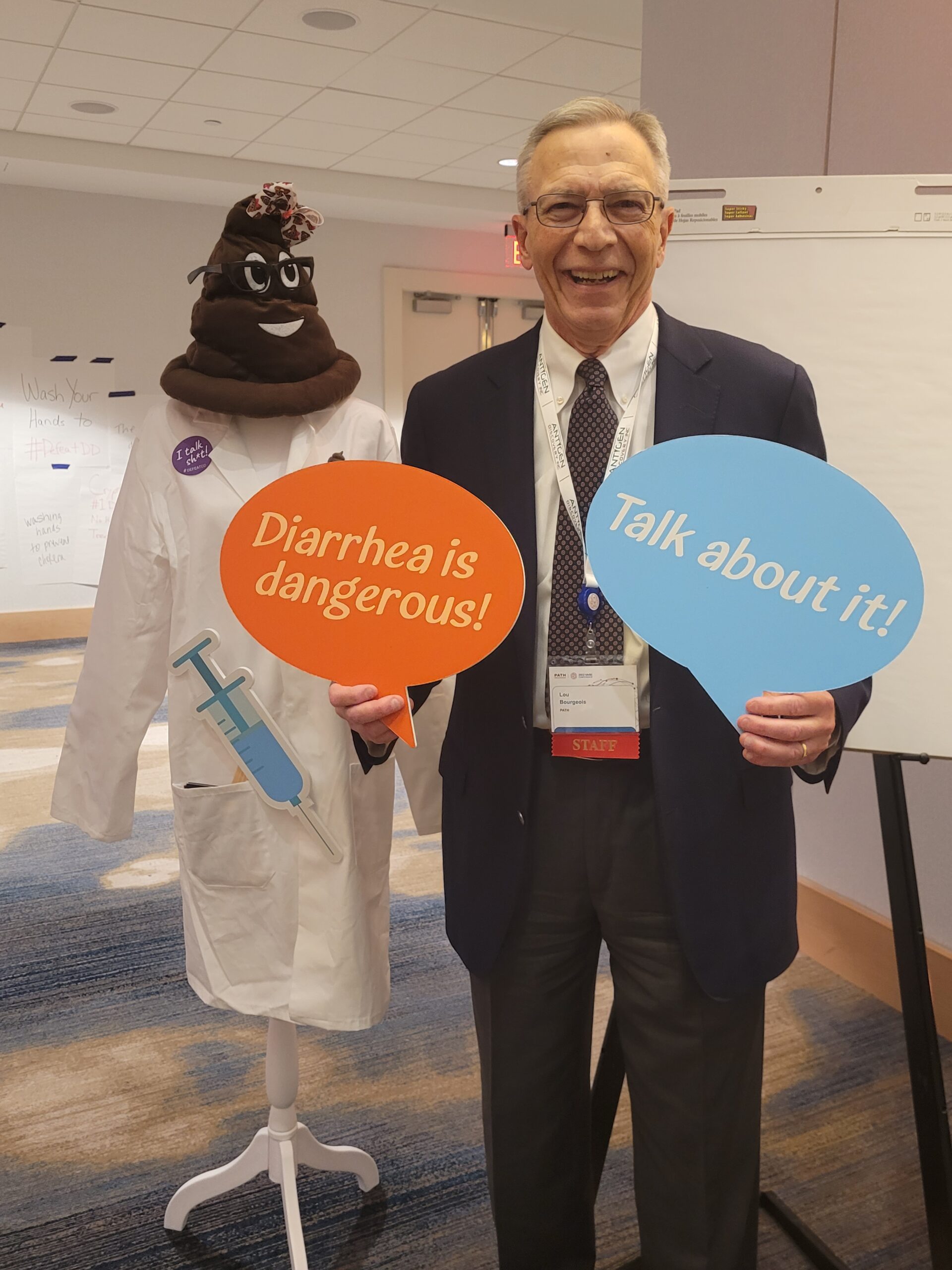 At the Vaccines Against Shigella and ETEC (VASE) Conference in 2022, Lou and Poo Guru tag team to raise awareness. Photo: Hope Randall.Q: What have you enjoyed most about working at PATH?