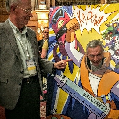 Another recent retiree, Dr. Richard Walker (left) points at scientist and vaccine superhero Lou Bourgeois during VASE Conference 2016. Photo: Hope Randall.Q: Where would you like to see the field of diarrheal disease research go next?