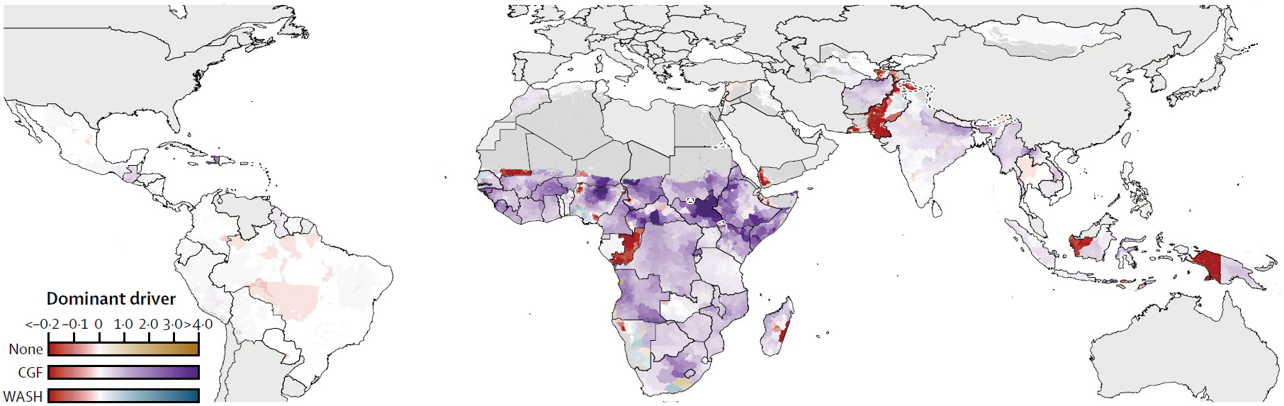 What has contributed to the reductions? We asked this question for all subnational areas using a similar analysis to previous work, focusing on two key risk factors in the main analysis. The first risk factor was child growth failure (or CGF), which is a component of malnutrition and means a child has not reached a healthy weight or height for their age. It reduces the ability of the child’s immune response to tackle a diarrheal infection. The second risk factor was access to improved water and sanitation (or WASH), which is important for preventing diarrhea transmission.