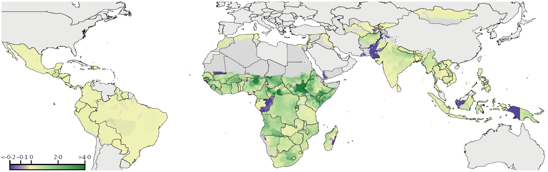 We estimated that almost 300,000 deaths were averted in 2017 due to reduced CGF and improved WASH. The map below shows how these reductions were distributed. The green scale shows the number of averted deaths per 1000 children, while the purple scale shows areas that experienced increases rather than reductions in risk factors.