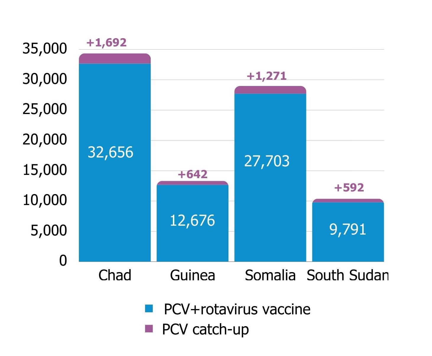 Using the LiST tool, we estimated an additional 4,197 children under age five can be saved across Chad, Guinea, Somalia and South Sudan if an annual PCV catch-up strategy was implemented alongside routine PCV and rotavirus vaccination, raising the number of lives saved to 87,023. It could also avert a further 78,122 cases of pneumonia, meningitis, and diarrhea across the four countries raising the number to 3.95 million cases averted.
