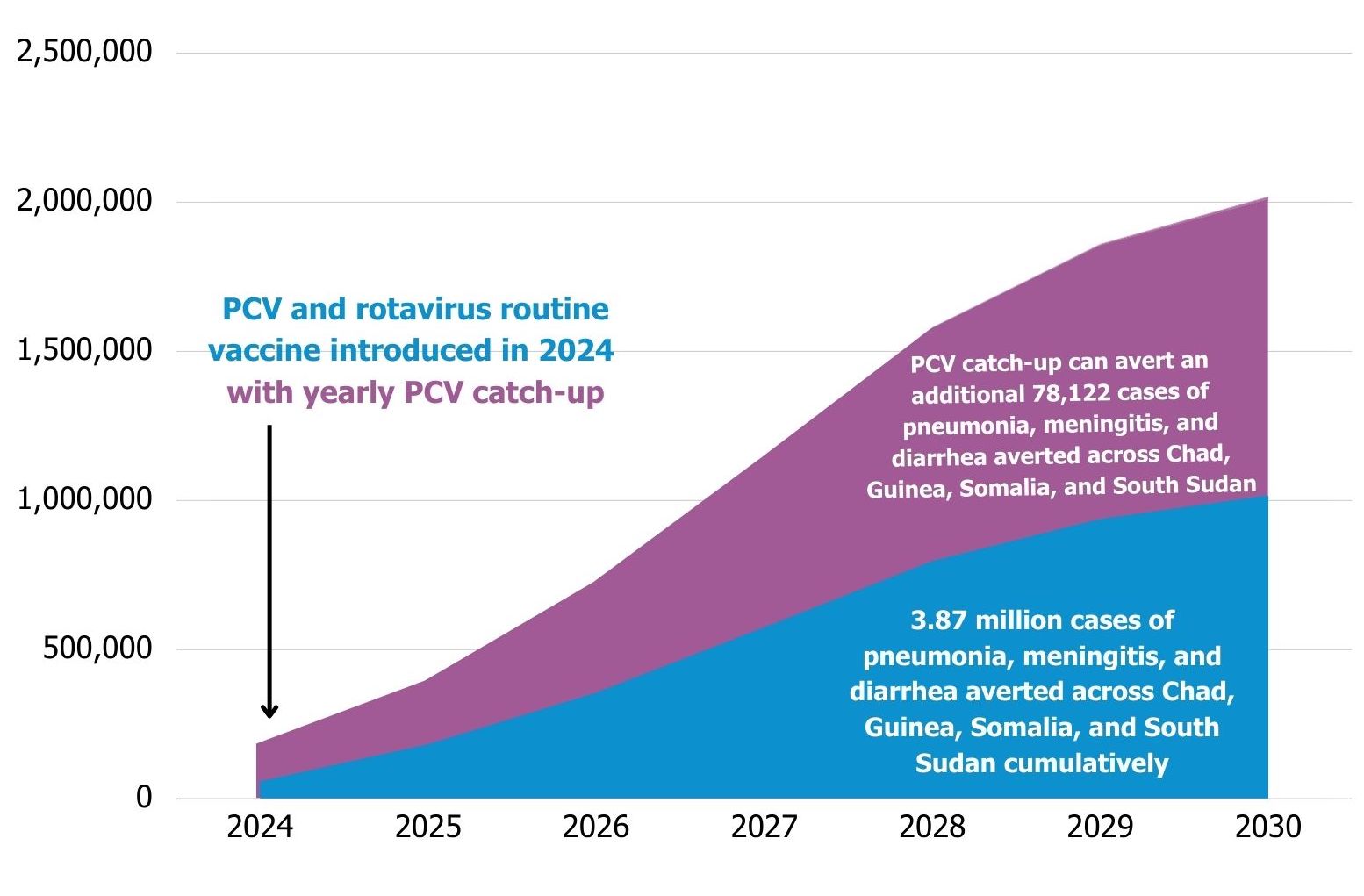 Using the Lives Saved Tool (LiST), a modeling system that estimates the impact of health interventions on mortality and morbidity, a team of researchers from the Johns Hopkins Bloomberg School of Public Health estimated that introduction and scale-up of PCV and rotavirus vaccines could save over 80,000 lives of children under age five and prevent nearly four million cases of childhood pneumonia, meningitis, and diarrhea in Chad, Guinea, Somalia, and South Sudan between 2024 and 2030.