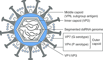 Rotaviruses are very diverse. They are classified into types depending on the composition of the two proteins that make up the virus’ external layer. The potential for these two proteins to appear in different combinations—through genetic exchange—increases diversity further.