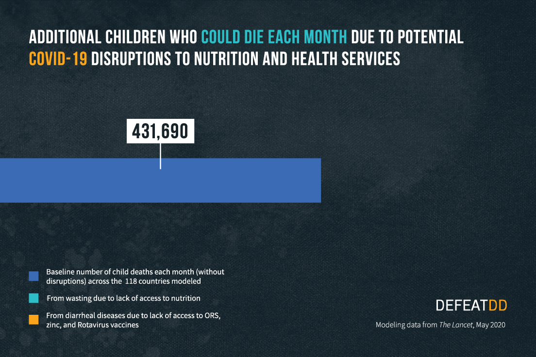 In fact, a recent modeling study in The Lancet demonstrated that, due to the indirect (yet very real) effects of COVID-19 restrictions, an additional 43,000 children around the world per month could die due to undernutrition. And undernourished children are susceptible to diarrhea – so if you add in the potential challenges to accessing treatments like ORS and zinc during COVID-19 (like social distancing measures and lowered capacity of the healthcare system), the number could rise to almost 60,000.