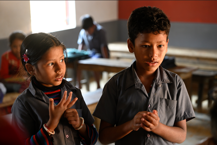 Shahjahan Ahmed (right) with his younger sister Mehbooba Khanam after receiving handwashing training at Krishna Chandra Lower Primary School. Photo: Siddharth Behl/SEEDS.