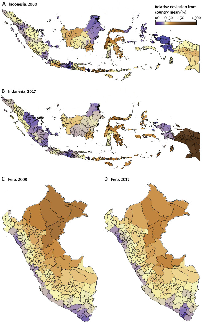 New IHME estimate show that countries such as Indonesia and Peru, pictured above, still experience substantial geographic disparities in diarrhea mortality. Source: IHME.