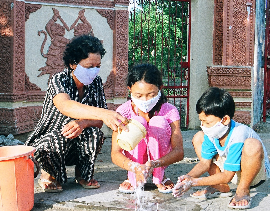Photo: A mother in Vietnam helps her children wash their hands while wearing face masks. The COVID-19 pandemic has made clear the links between health and handwashing.