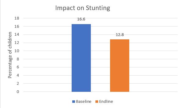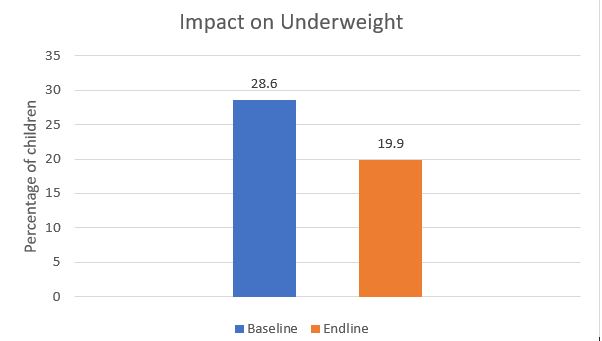 The impact of the intervention was measured in six districts of Karnataka with two years of intervention. There was a 9% reduction in underweight cases and a 3.8% decrease in stunting. The study also documented positive impact on reducing morbidity as incidences of children falling sick reduced from 37% to 16% while of diarrhea decreased from 4.33% to 0.83%.