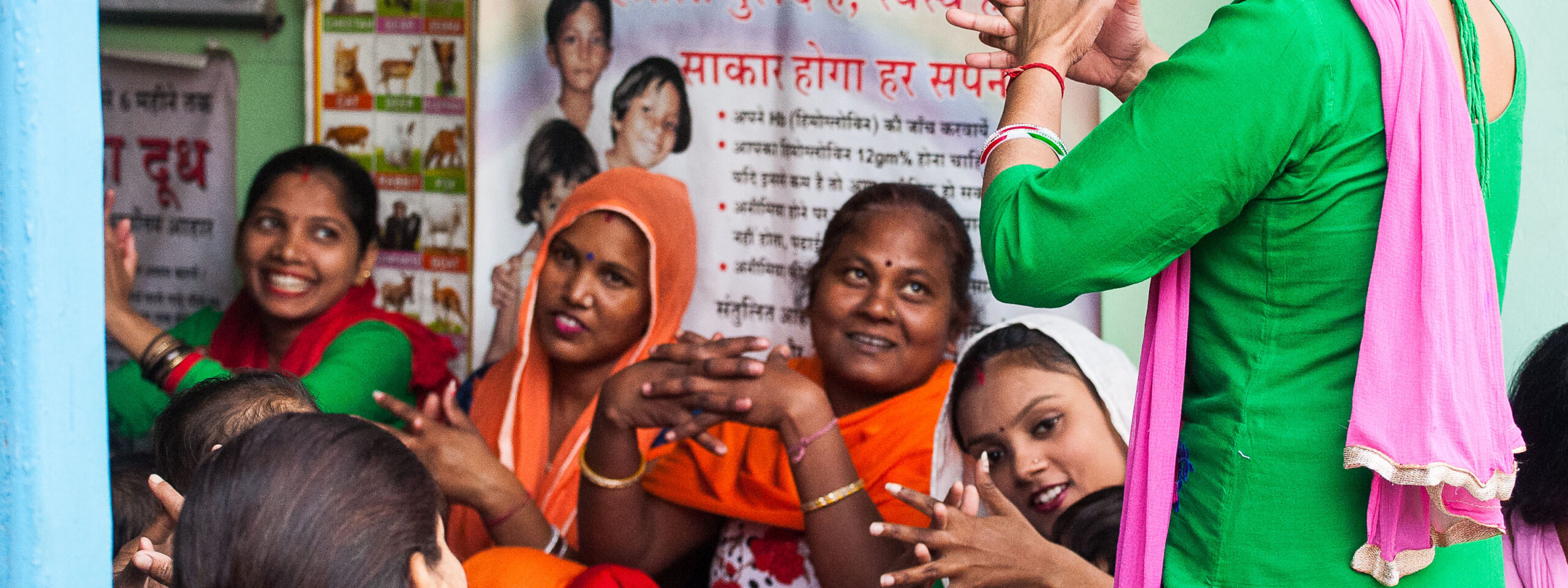 A group of women wearing colorful clothing sit and listen attentively to a person speaking in the foreground. There are posters with text in the background.