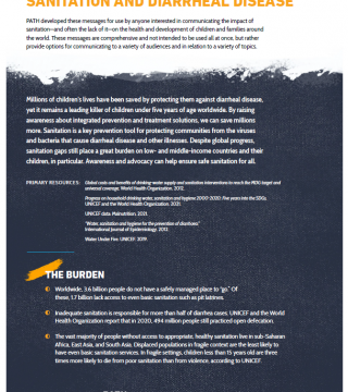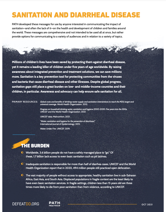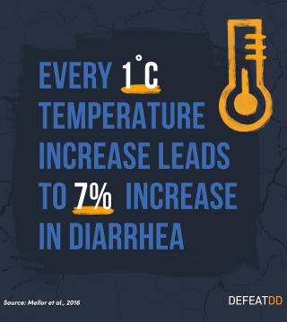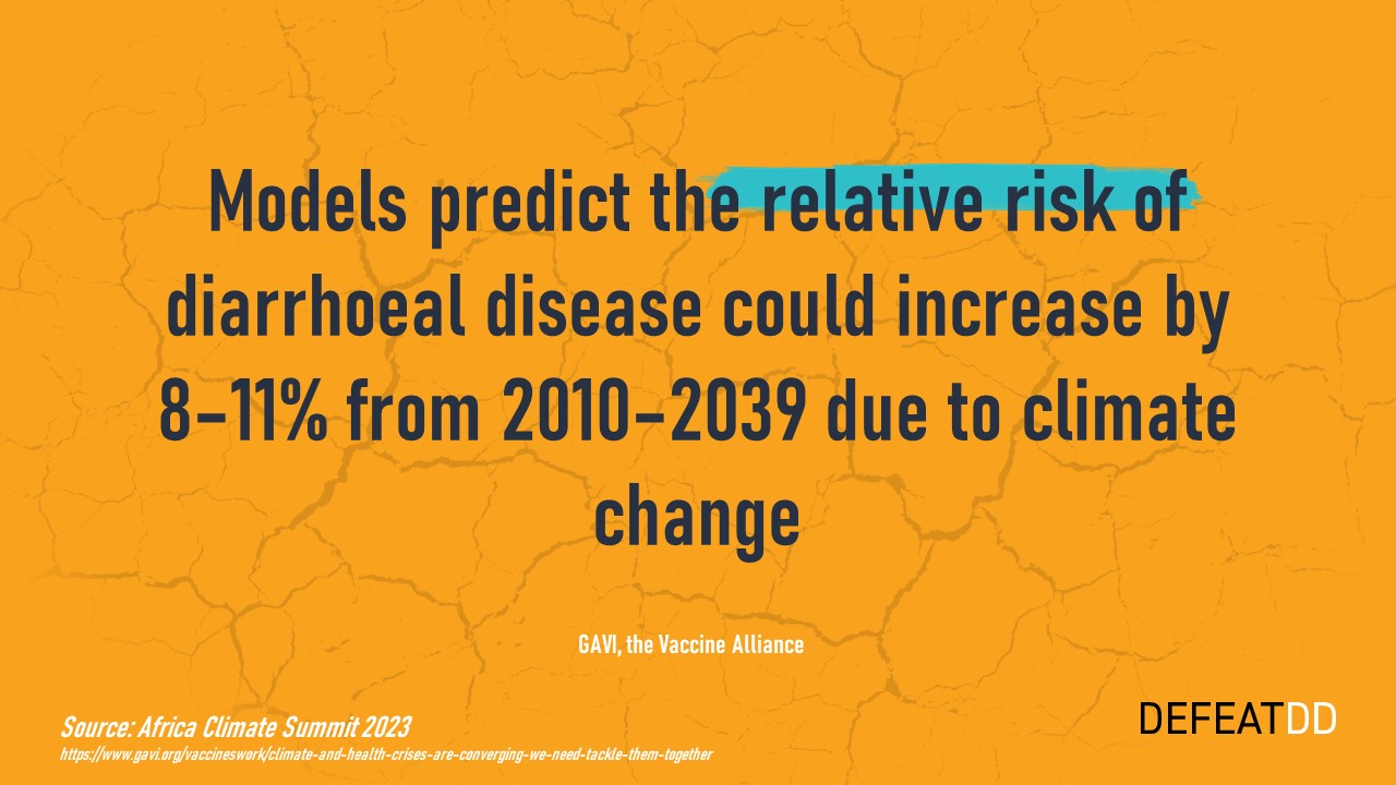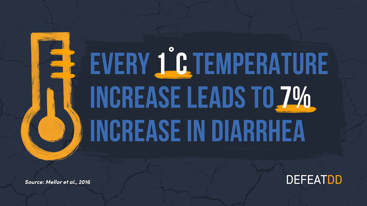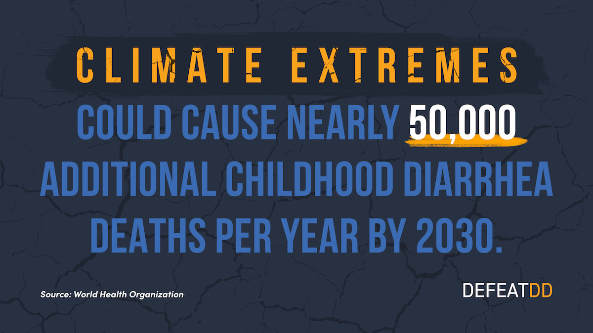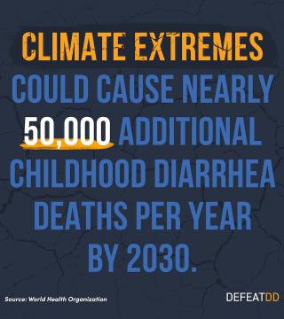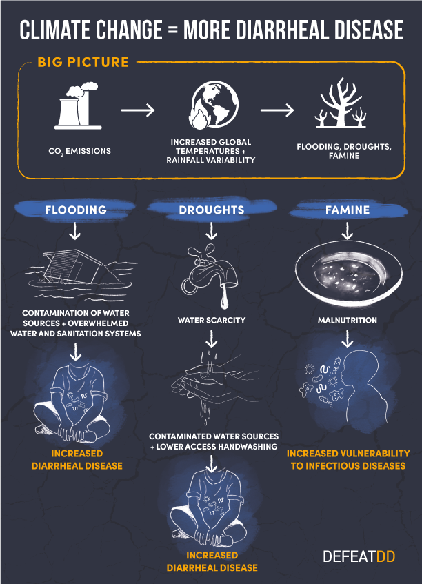 Flooding and heavy rainfall overwhelm water and sanitation systems, leading to contamination of water sources with diarrheal pathogens and, ultimately, more diarrheal disease. Droughts and fires result in water scarcity, leading to the use of unsafe water sources and lower access to handwashing, which also causes increased diarrheal disease. Finally, climate change-linked famine and malnutrition will also put children at increased risk of all infectious disease, putting more urgency behind prevention efforts.