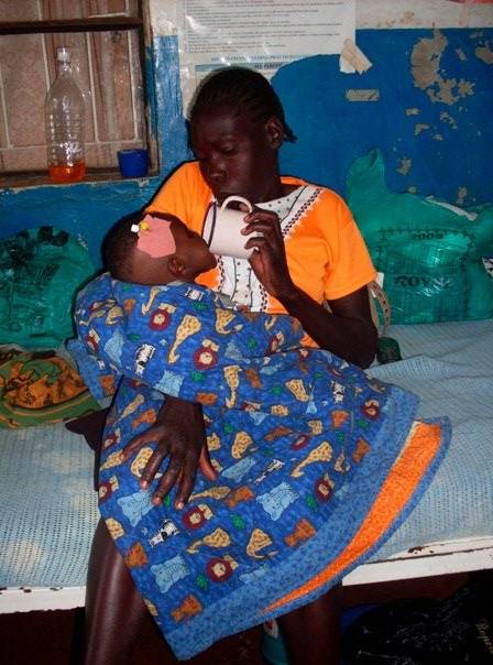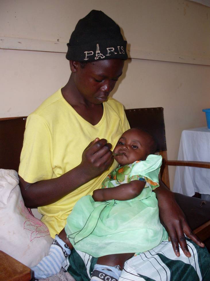 This severely dehydrated child is now on the mend. Having been treated with IV infusions for five days, she is now receiving ORS.