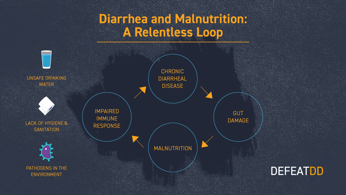 As they grow older, malnourished children suffer further with each diarrheal episode. A relentless cycle of gut damage and repeat infections prevents nutrient absorption and blunts the immune system. Diarrhea contributes to chronic malnutrition, which can ultimately stunt children’s cognitive and physical growth.